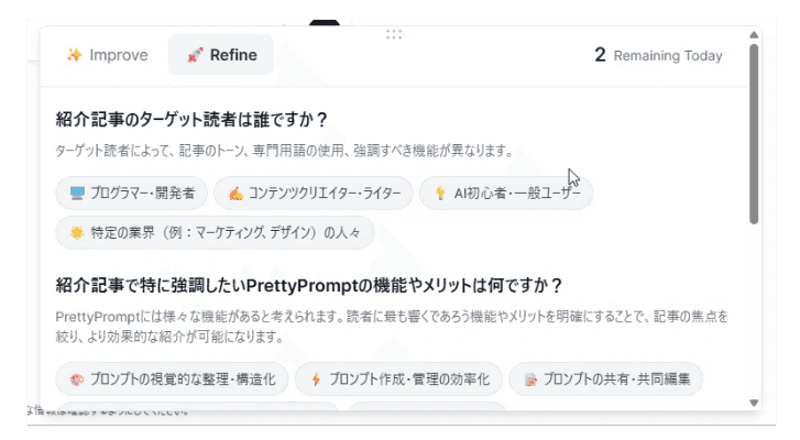 といった具体的で効果的なプロンプトに変換されます。 また、提案もしてくれて、内容の掘り下げが可能です。